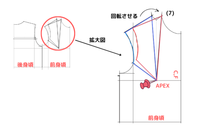 ⑺APEX(バストポイント)にピンを打ち、このピンを中心点として青線で囲った四角形を前首側に回転させ、赤線の四角形のように首ぐりにつけます。