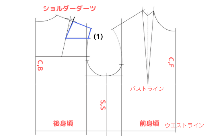 この線からアームホールの上側→肩線→バストダーツ線で四角形を囲む。