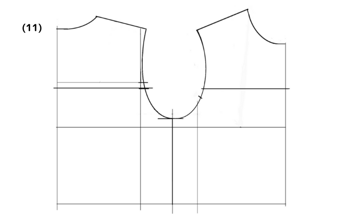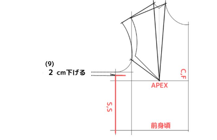 ⑼前身頃の袖底線を2cm下げる。