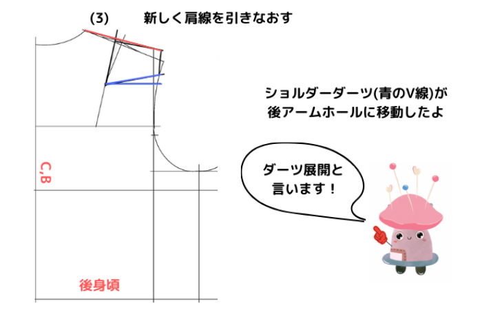 肩ダーツの分量が後アームホール(袖ぐり)に移動し袖ぐりのゆとりに変わります。