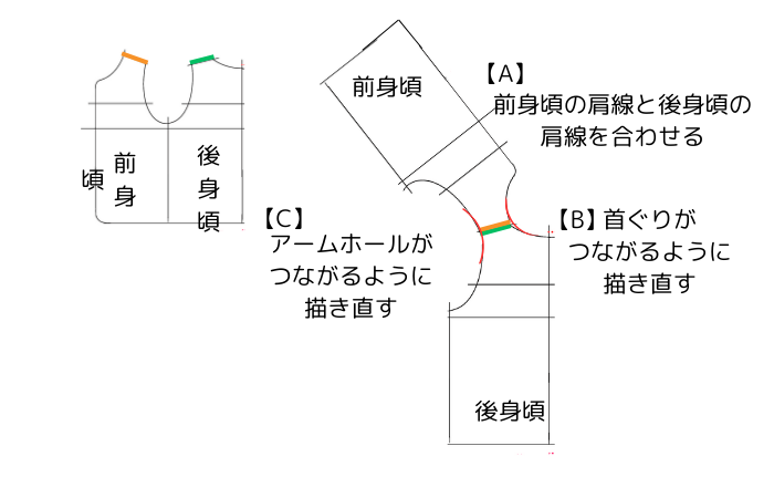 【A】前身頃の肩線と後身頃の肩線を合わせます。
