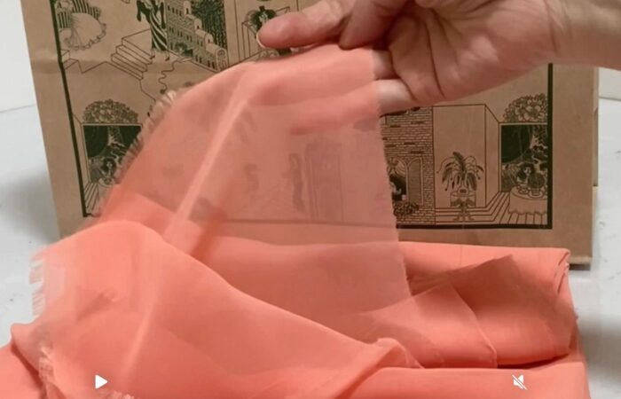 視聴者の皆様から「袖の取り外しのできるブラウスにしてほしい」と言うリクエストを多数いただきましたので、ついに作ってみました。使用する生地は、ショート動画でも登場したシフォンジョーゼット50 D(デニール)です。