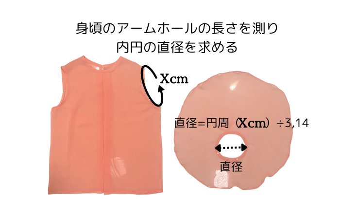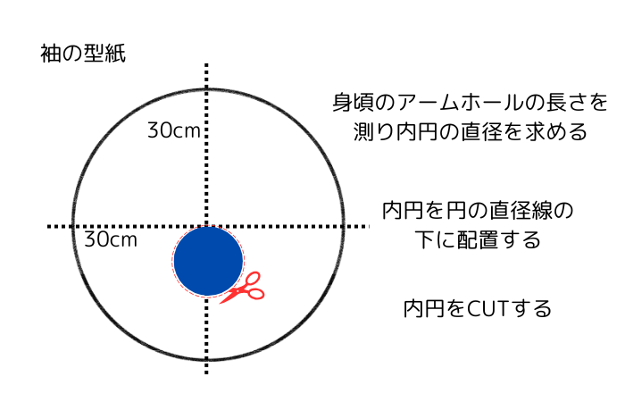 袖丈の長さが円形の半径になります。身頃のアームホールの長さが袖の内円の円周の長さになります。
