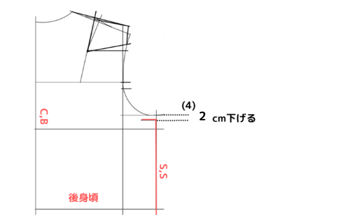 ⑷後袖底を2cm下げる。
