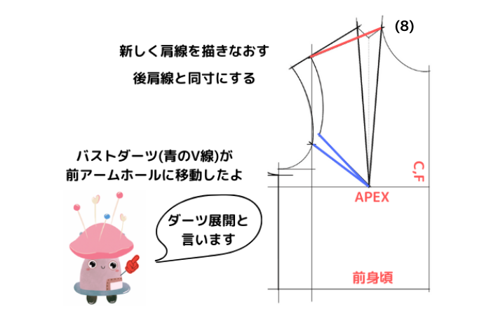 ⑻新しく肩線を描きなおす。(後肩線と同寸にする)
