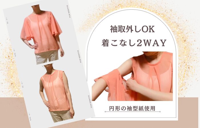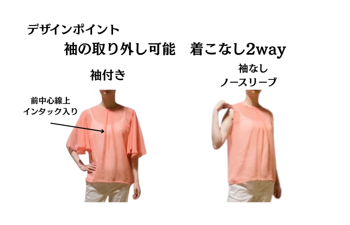 袖丈も少し長めにし、二の腕カバーもできます。取り外しすれば、ノースリーブになり、2wayで着こなすことができます。ちょっと欲張りなブラウスです。