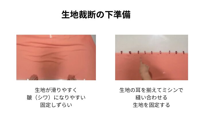 シフォン生地の裁断で大切なことは、ズレないこと!非常に滑りやすい生地なので、ズレないよう裁断すること!