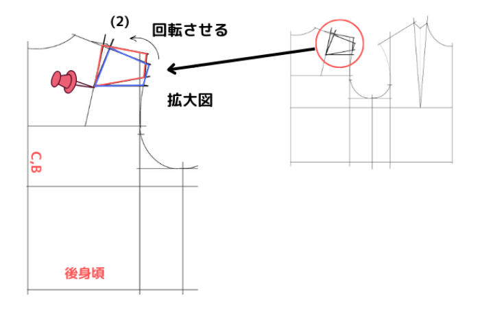 ⑵ショルダーダーツの先端にピンを打ち、ピンを中心点として青線で囲まれた四角形を首ぐり側に回転させる。