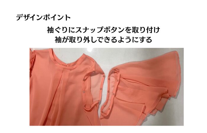 今回は、視聴者の方から、「取り外しのできる袖にしてほしい」のご提案で、袖ぐり周りと身頃のアームホールにスナップボタンを取り付け、取り外しできるよう工夫しました。