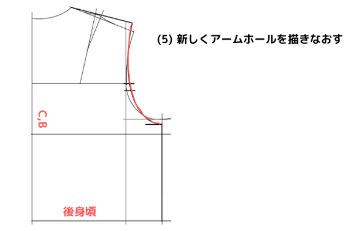 ⑸新しくアームホールを描きなおす。 肩先から始まり、2cm下げた袖底まで新しくアームホール線を描き直します。