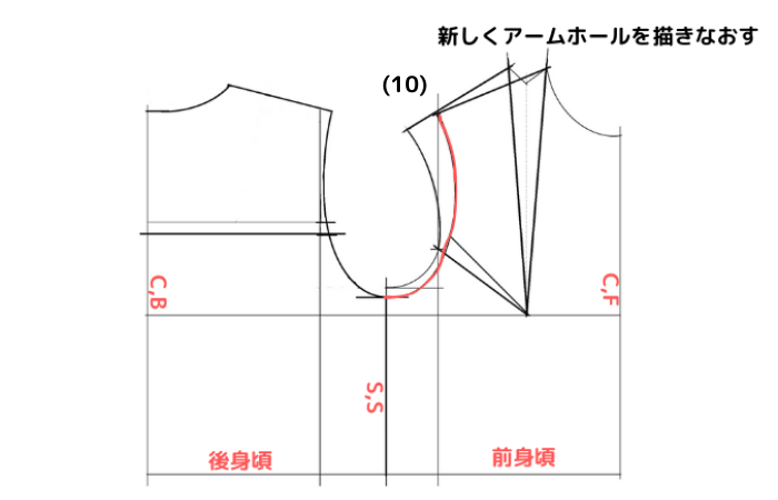⑽新しく描きなおした肩線から2cm下げた袖底まで、新しくアームホールをかきなおす。