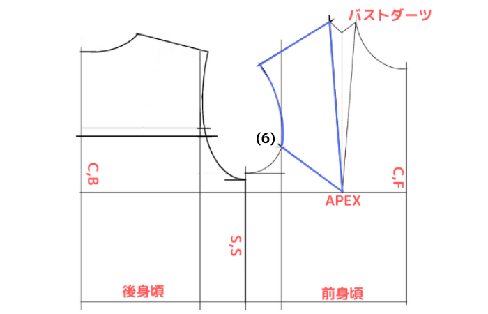 ⑹前アームホールのクロスマークからAPEX(バストポイント)に直線を引く。