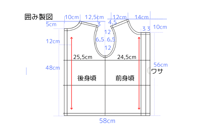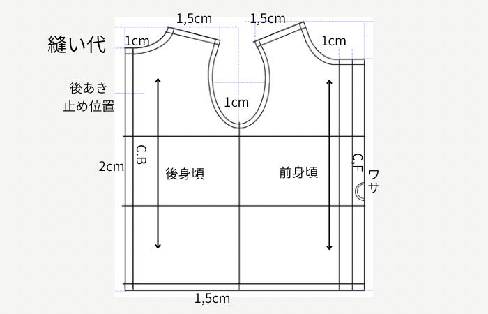 確認の仕方 前首ぐりの長さ+後首ぐりの長さ+あき止めの長さを計算します。合計の長さが頭の長さ以上あれば大丈夫です。