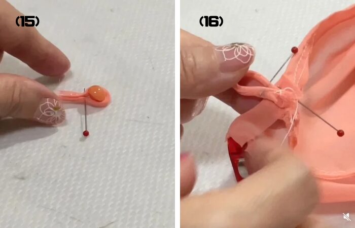 (16) ループを首のパイピングに挟み、とりつけます。