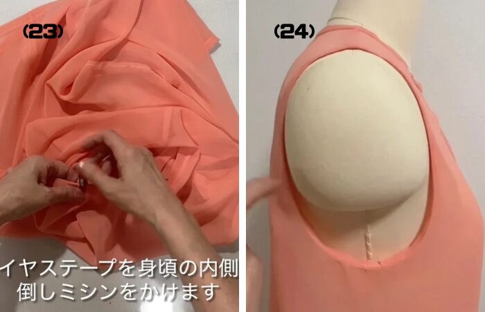 (23) バイヤステープを身頃の内側に倒しミシンをかけます。