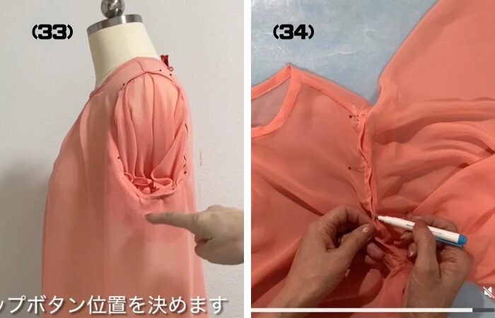 (34) 身頃側と袖側にスナップボタン位置の印を付けます。(水で消えるチャコペン使用)