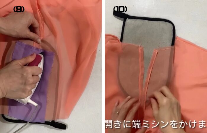 ⑼ 後背中心線の縫い代を割り、アイロンをかけます。あて布をしてからアイロンをかけます。