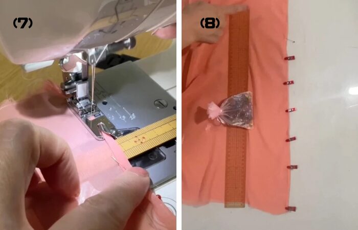 (32) まち針を打ちかえ落としミシンをかけます。