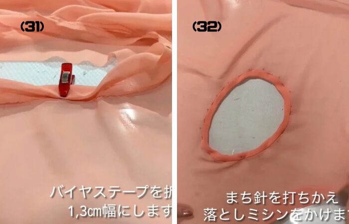 (30) 袖の内側にバイアステープを巻いていきます。ミシンで縫い合わせます。