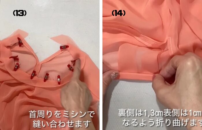 (17)首ぐりの内側をパイピングで包み込みピンでとめます。