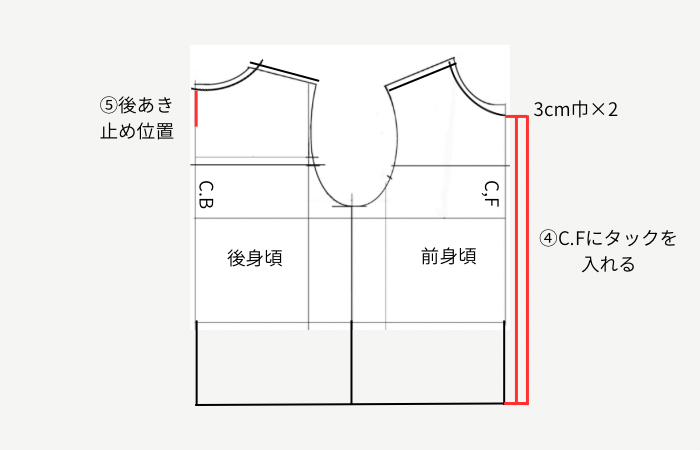 ④ 前身頃のC,F(センターフロント)にタックの分量を加えます。3cmのインタックにします。C,Fを新しく描いたタック線に移動し、ワサにします。
