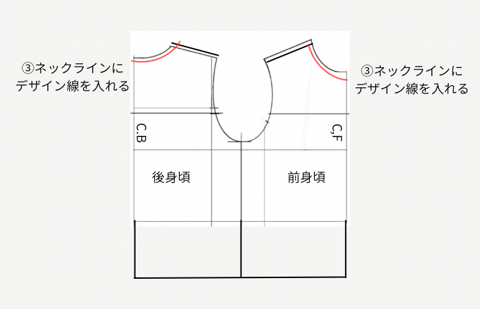 ③ ネックライン(前首ぐりと後首ぐり)にデザイン線を入れます。
