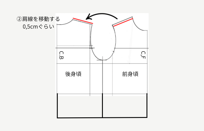 ② 肩線を移動します。 前肩線を0,5cm削ります。後肩線は0,5cm増やします。