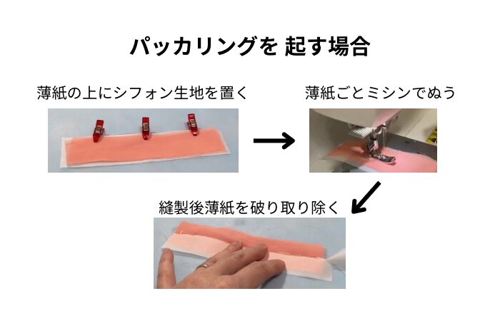 パッカリングを起こす場合、薄紙を生地下に置き、ミシンで縫製して下さい。