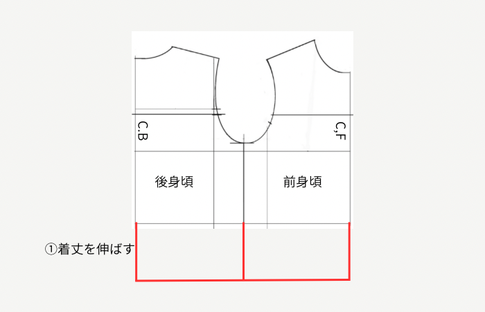 ① 着丈をプラスします。後身頃中心線と前身頃中心線、脇線を伸ばします。(着丈はお好みでどうぞ。)